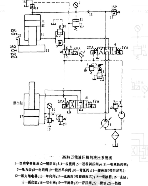 5、最后主缸停止時的狀態(tài) ,當(dāng)主缸滑塊上的鐵23按下沖程開關(guān)1SQ時,電磁鐵2YA被切斷,主缸活塞被位于M功能中心的閥門6鎖定,停止運動,返回行程結(jié)束。此時,泵1油通過閥門6,閥門21返回油箱,泵處于卸載狀態(tài)。在實際使用中,主汽缸可以在任何時候停下來。